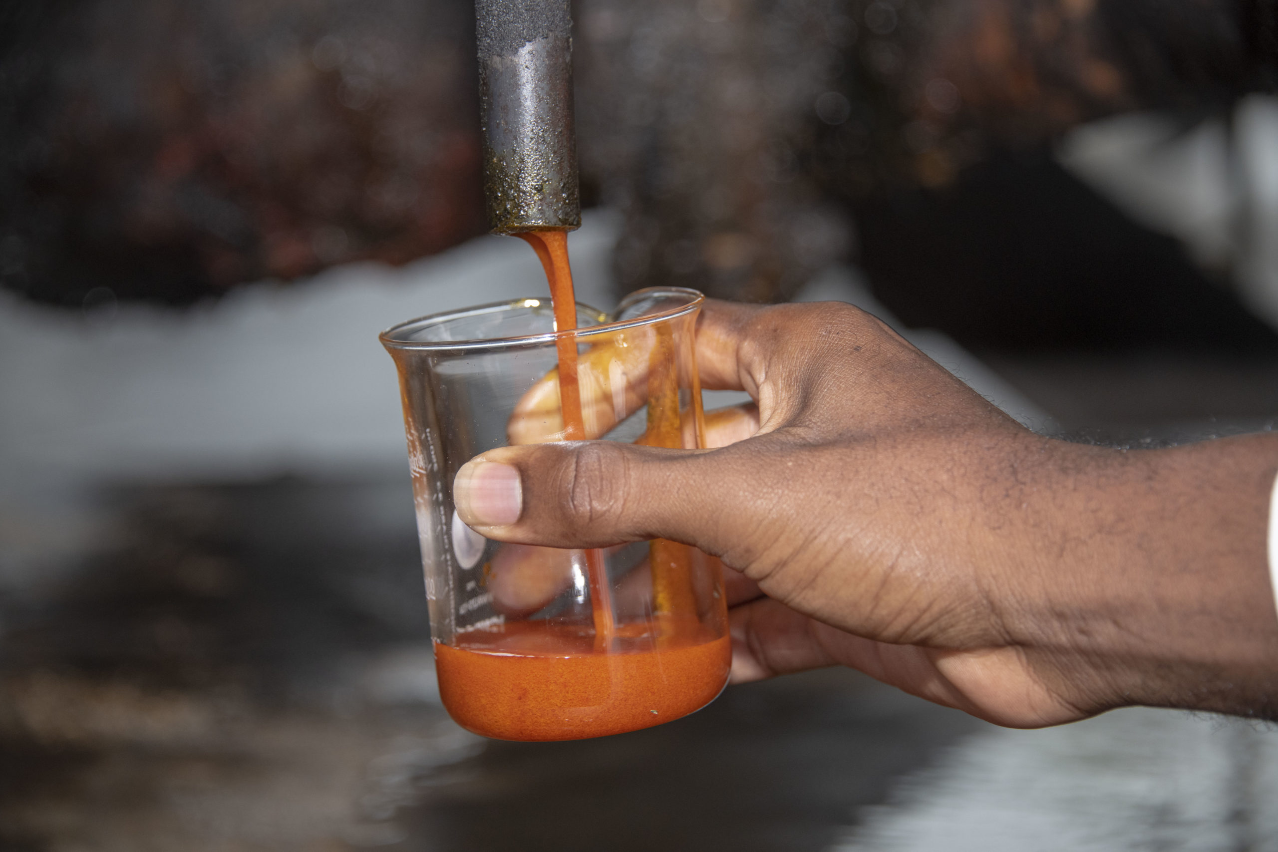 Avant l’étape du pressage, une opération de malaxage mécanique et thermique conditionne les fruits pour la presse. Lors du pressage, l’huile brute est extraite, les fibres et les coques sont mises de côté et serviront à produire de l’énergie ou serviront d’engrais organiques. La dernière étape, la clarification, permettra de séparer par décantation l’huile de palme brute (le produit fini) du reste des jus (eau, matière végétale, etc.).